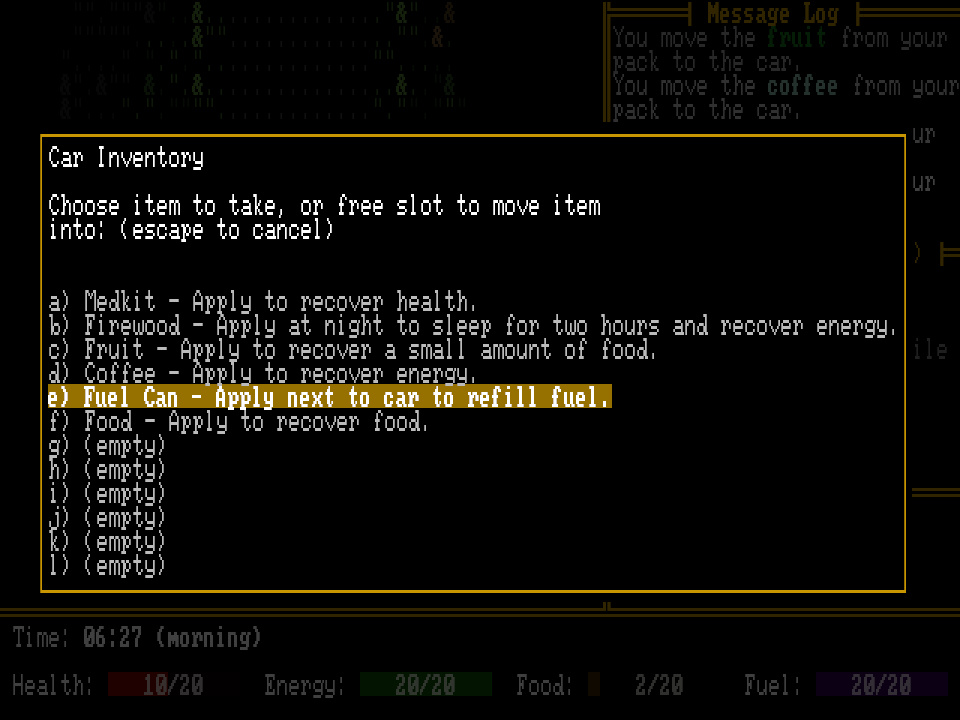 Today I added a terrain generator for a forest biome, implemented the game’s basic systems, added a few hostile NPCs, a car inventory where items can be exchanged with the player’s inventory, and items for recovering health, energy, food, and fuel.