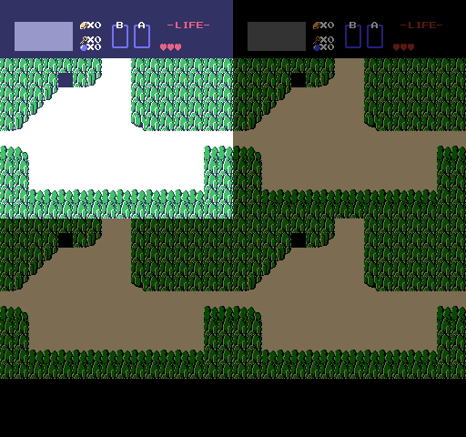 The Legend of Zelda can’t completely hide this trick from players. It produces a visible artefact on vertical screen transitions which you can see if you look closely. When moving up between rooms, the first frame of the scroll animation scrolls down instead. Here’s the animation in extreme slow motion.