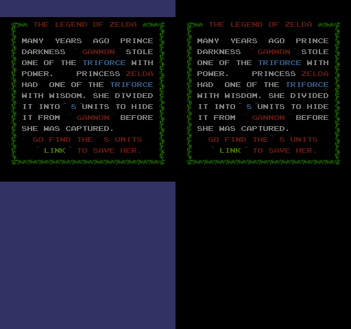 Some games don’t ever need to change mirroring, so their cartridges are hardwired to either horizontal or vertical mirroring. Other games need to dynamically switch between the two modes, so their cartridge can be configured by software to mirror horizontally or vertically. The Legend of Zelda falls into this category. Finally, some really fancy games come with extra video memory in the cartridge, which means they don’t need to mirror at all, and can scroll horizontally and vertically at the same time without any visible duplication.